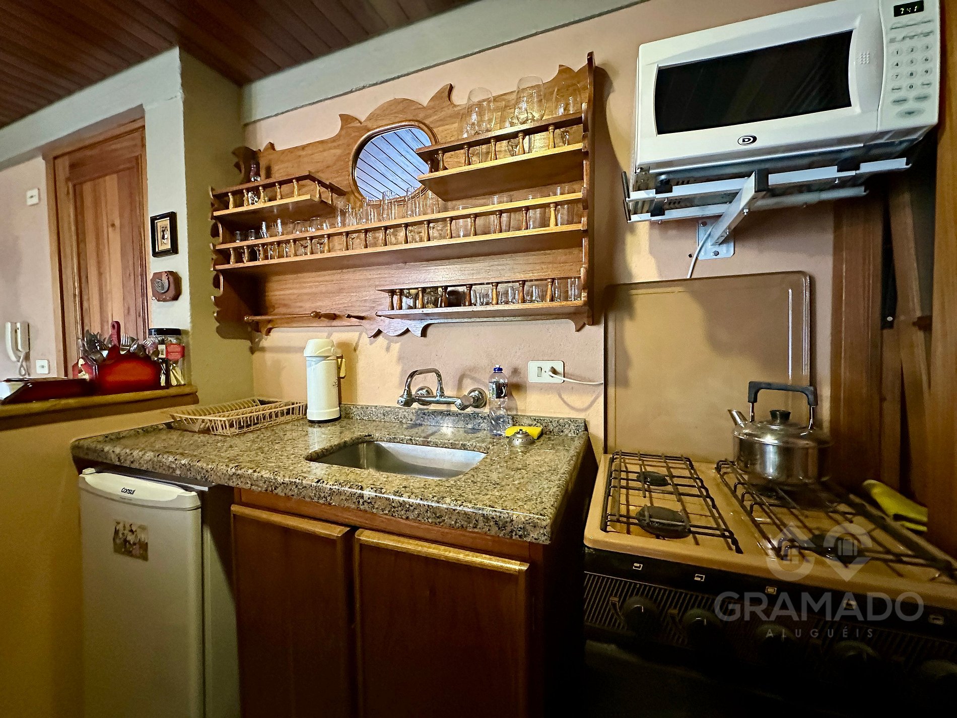 Cozinha compacta, funcional e equipada para refeições simples