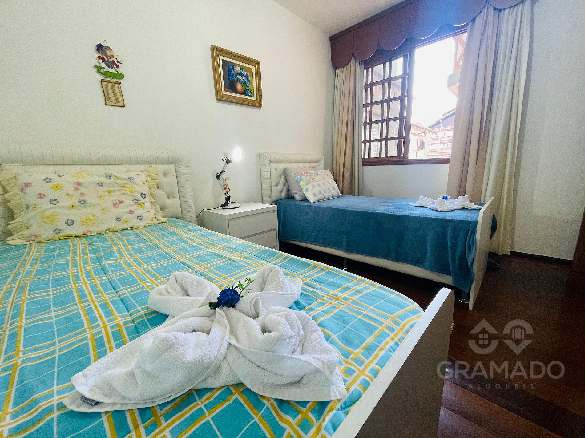 Dois dormitórios confortáveis, com camas de qualidade e bastante espaço para relaxar.